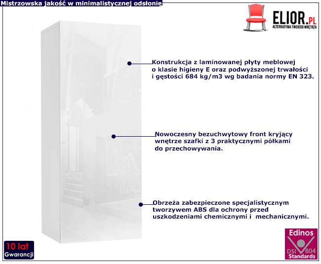 - Modna kolorystyka: Biały połysk. Kliknij w link i sprawdź także inne białe szafki i półki wiszące w sklepie Edinos.pl. Stwórz swój praktyczny zestaw mebli.