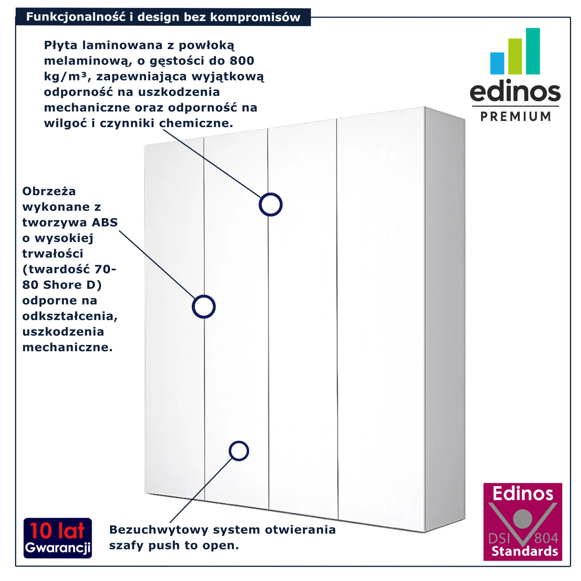 • Produkt posiada certyfikat jakości "Edinos Standards DSI 804", który potwierdza najwyższą jakość wykonania mebla oraz pełny stopień zgodności poszczególnych jednostek wytworzonego wyrobu z przyjętym wzorcem.