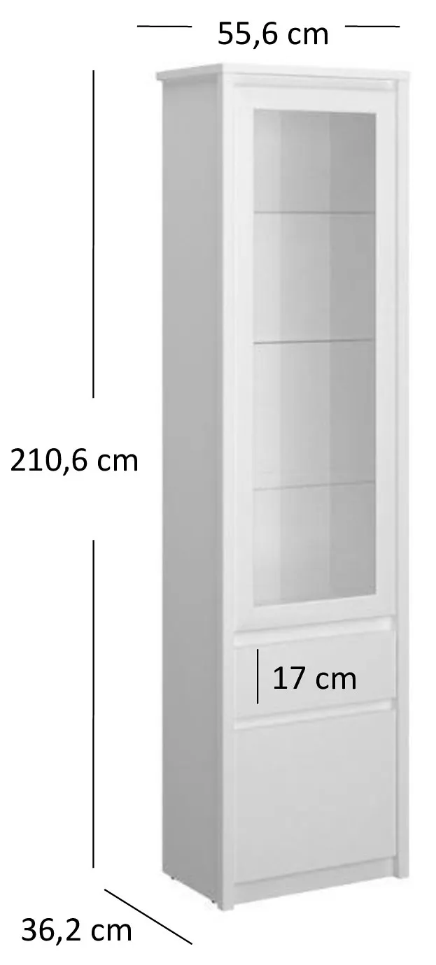 Bardzo solidna i starannie wykończona witryna. Biały kolor jest czysty, bez przebarwień, a szkło osadzono równo i stabilnie. Po ustawieniu mebel dodaje wnętrzu lekkości i elegancji. Podoba mi się też to, że całość jest stabilna mimo wysokości. Wg mnie jest naprawdę warta swojej ceny.