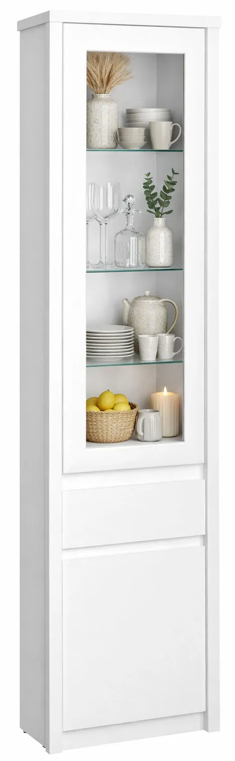 Elegancka forma i praktyczne rozwiązania spotykają się w jednym meblu – witryna wysoka Sierra 18X marki Edinos Premium to stylowy sposób na ekspozycję ulubionych dekoracji i jednoczesne uporządkowanie przestrzeni. Dzięki swojej smukłej, wysokiej bryle i białej kolorystyce witryna optycznie powiększa wnętrze i doskonale wpisuje się zarówno w jasne, jak i ciemniejsze aranżacje. Górna część za przeszklonym frontem to idealne miejsce na książki, szkło dekoracyjne, porcelanę lub pamiątki rodzinne, natomiast dolna zamykana szafka i praktyczna szuflada pozwolą przechować przedmioty, które chcesz ukryć przed wzrokiem gości. To mebel, który perfekcyjnie łączy estetykę z funkcjonalnością.