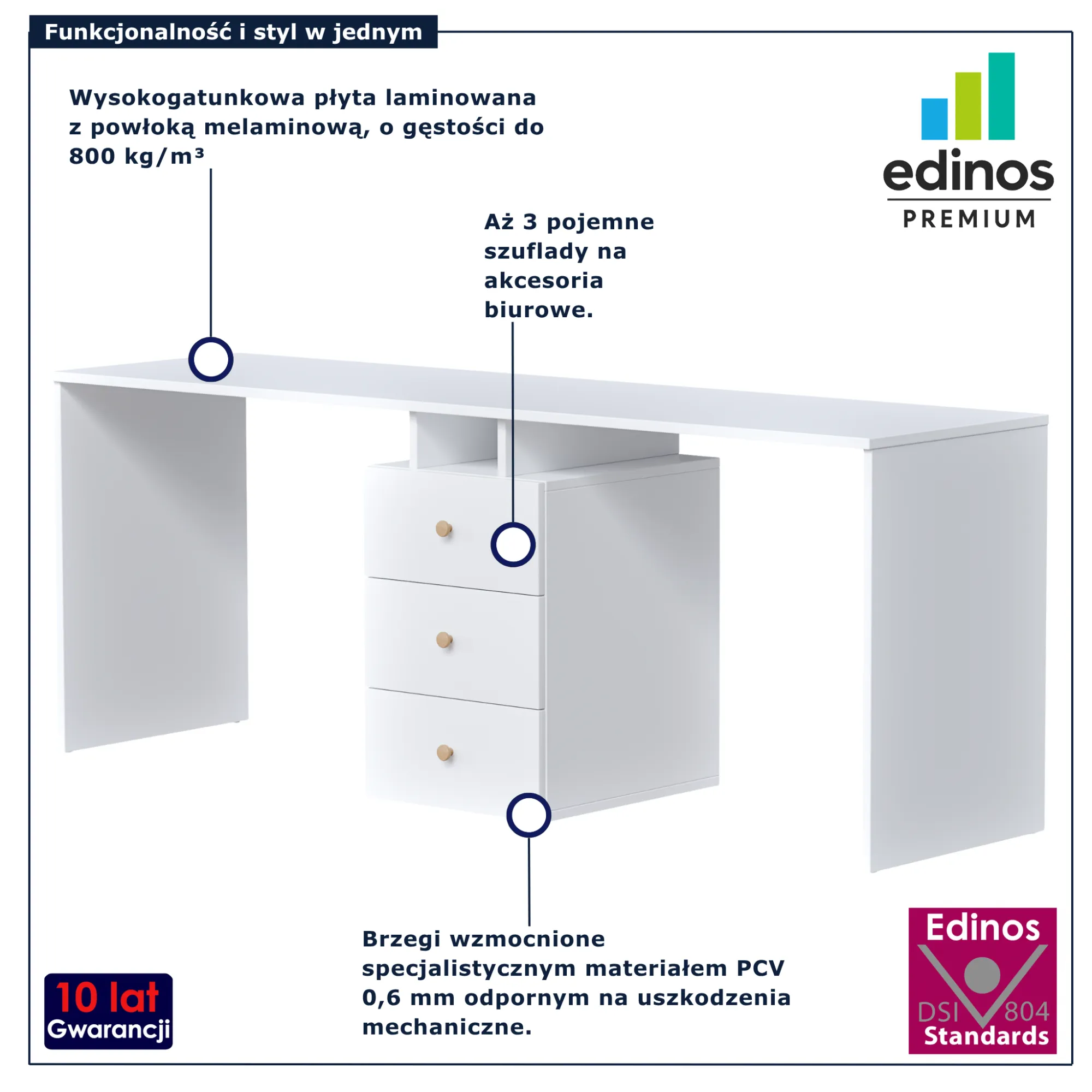 Biurko dwuosobowe Tadoro 3X marki Edinos Premium to idealne połączenie estetyki i funkcjonalności, które sprosta oczekiwaniom nawet najbardziej wymagających użytkowników. Dzięki niemu zyskasz uporządkowaną przestrzeń do pracy i nauki, sprzyjającą koncentracji oraz efektywności. To inwestycja w komfort, który odczujesz każdego dnia. Postaw na sprawdzone rozwiązania i styl, który nie wychodzi z mody. Zainwestuj już dziś w atrakcyjnej cenie 768 zł i odmień swoją przestrzeń pracy!