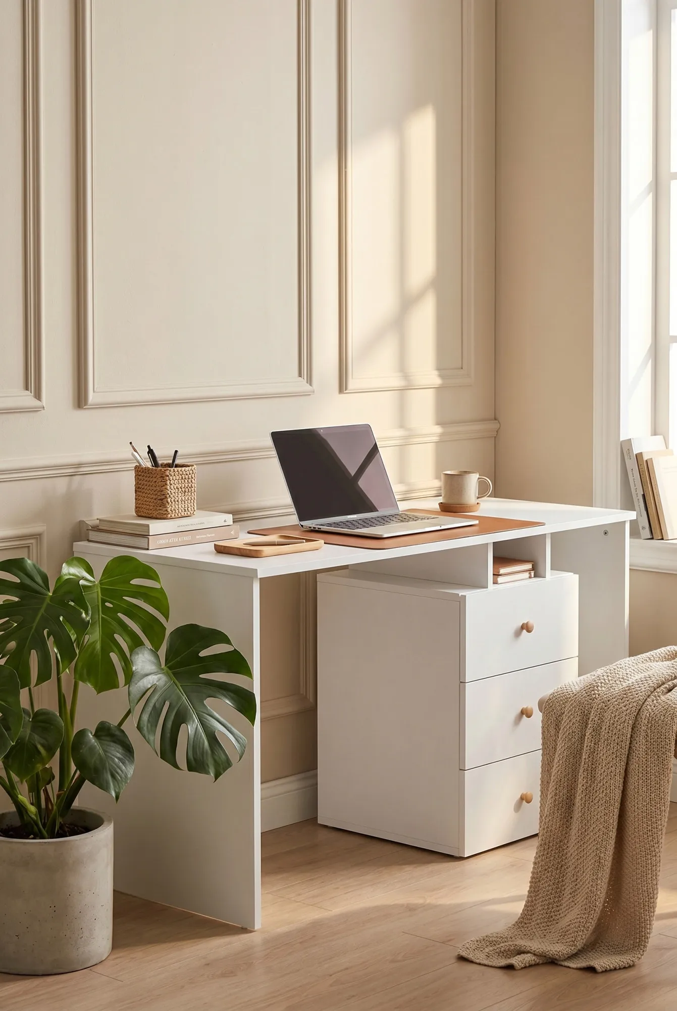Przykładowa aranżacja wnętrza z białym biurkiem dwuosobowym Tadoro 3X