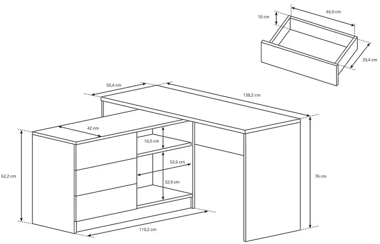 • biurko: szerokość 138,2 cm, wysokość 76 cm, głębokość 50,4 cm