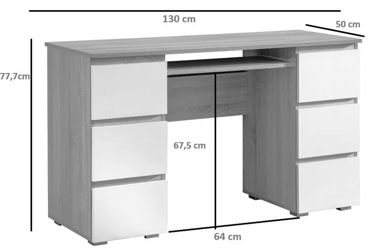 • Wymiary: szerokość: 130 cm, głębokość: 50 cm, wysokość: 77,7 cm, szerokość przestrzeni na nogi: 64 cm, wysokość przestrzeni na nogi: 67,5 cm.