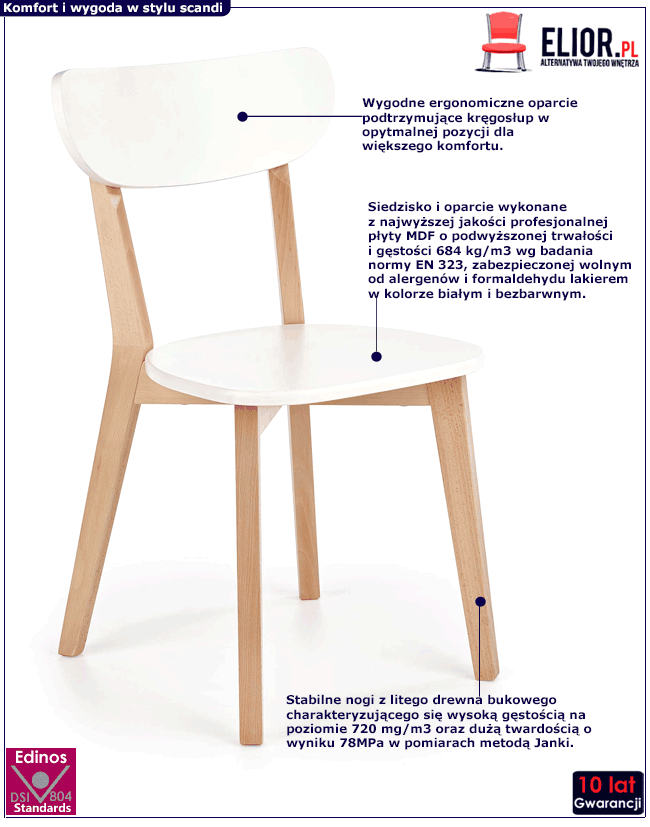 • Materiał: Naturalne lite drewno bukowe w kolorze oraz wysokiej jakości profesjonalna płyta MDF o podwyższonej trwałości i gęstości do 684 kg/m3 wg badania normy EN 323. Szukasz innych krzeseł w skandynawskim stylu? Kliknij w link i sprawdź krzesła skandynawskie w sklepie Edinos.pl.