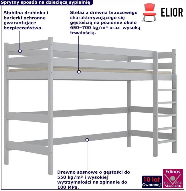 Dotyczy: Szare sosnowe łóżko dla dziecka na antresoli Jukki - 5 rozmiarów