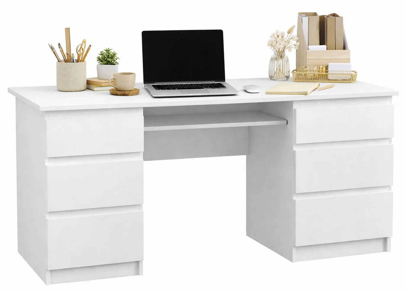 świetne rozwiązanie, jeśli zależy Ci na porządku wysuwana półka na klawiaturę pomaga utrzymać więcej miejsca na głównym blacie, a 6 pojemnych szuflad mieści przybory, zeszyty i drobiazgi