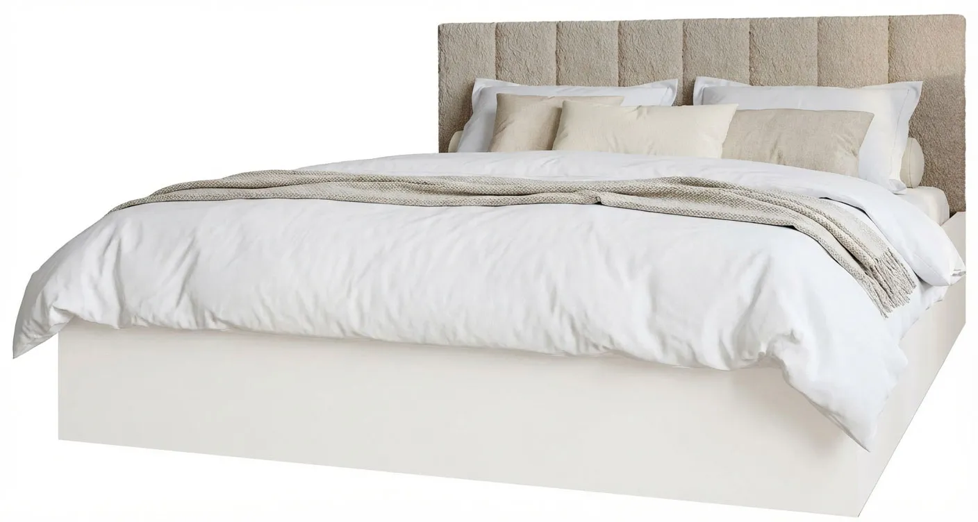 Aranżacja nowoczesnej sypialni z wykorzystaniem białego łóżka z beżowym zagłówkiem boucle Berigi 3X