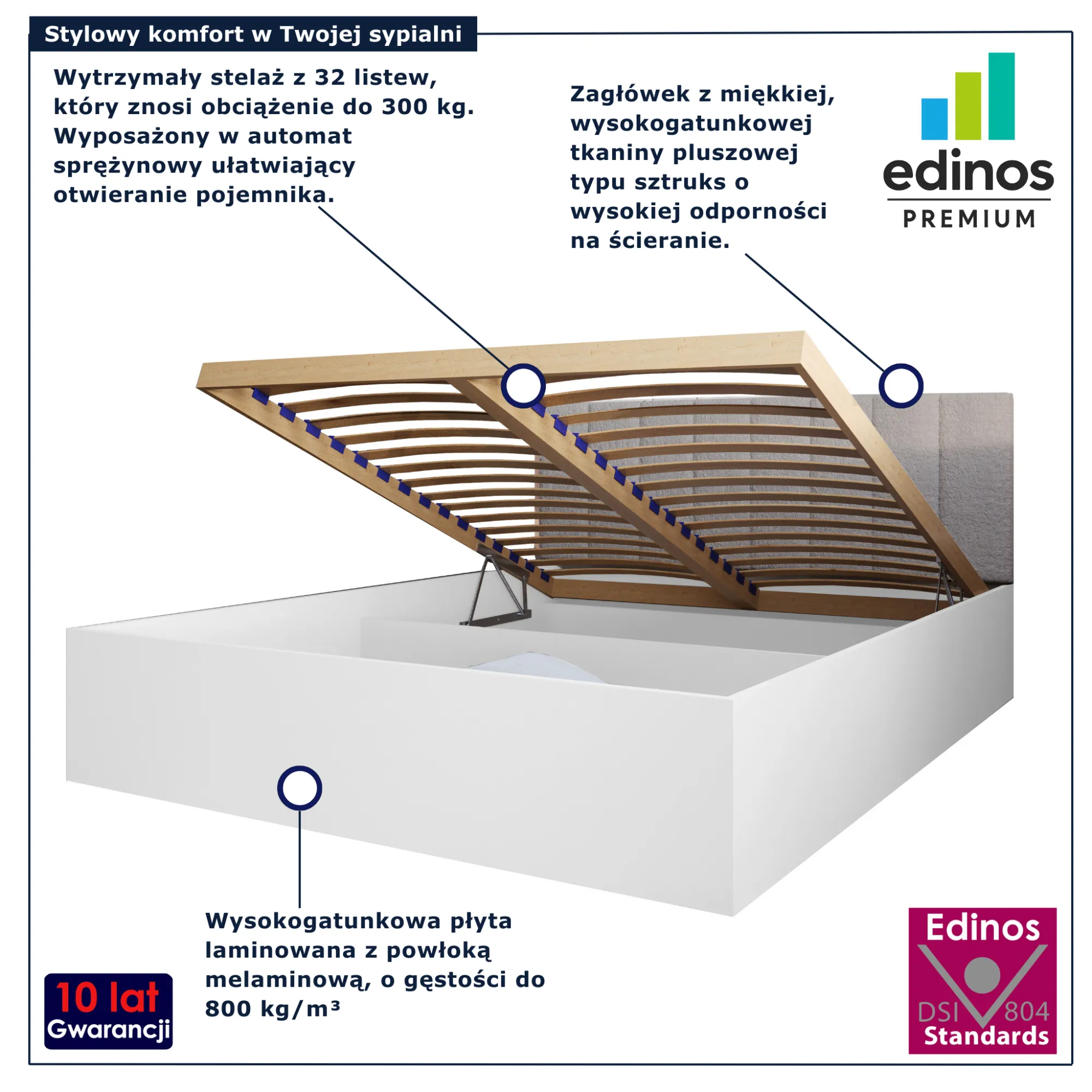 • Łóżko posiada stelaż z 32 listew odpowiedni dla łóżka dwuosobowego, który znosi obciążenie do 300 kg.