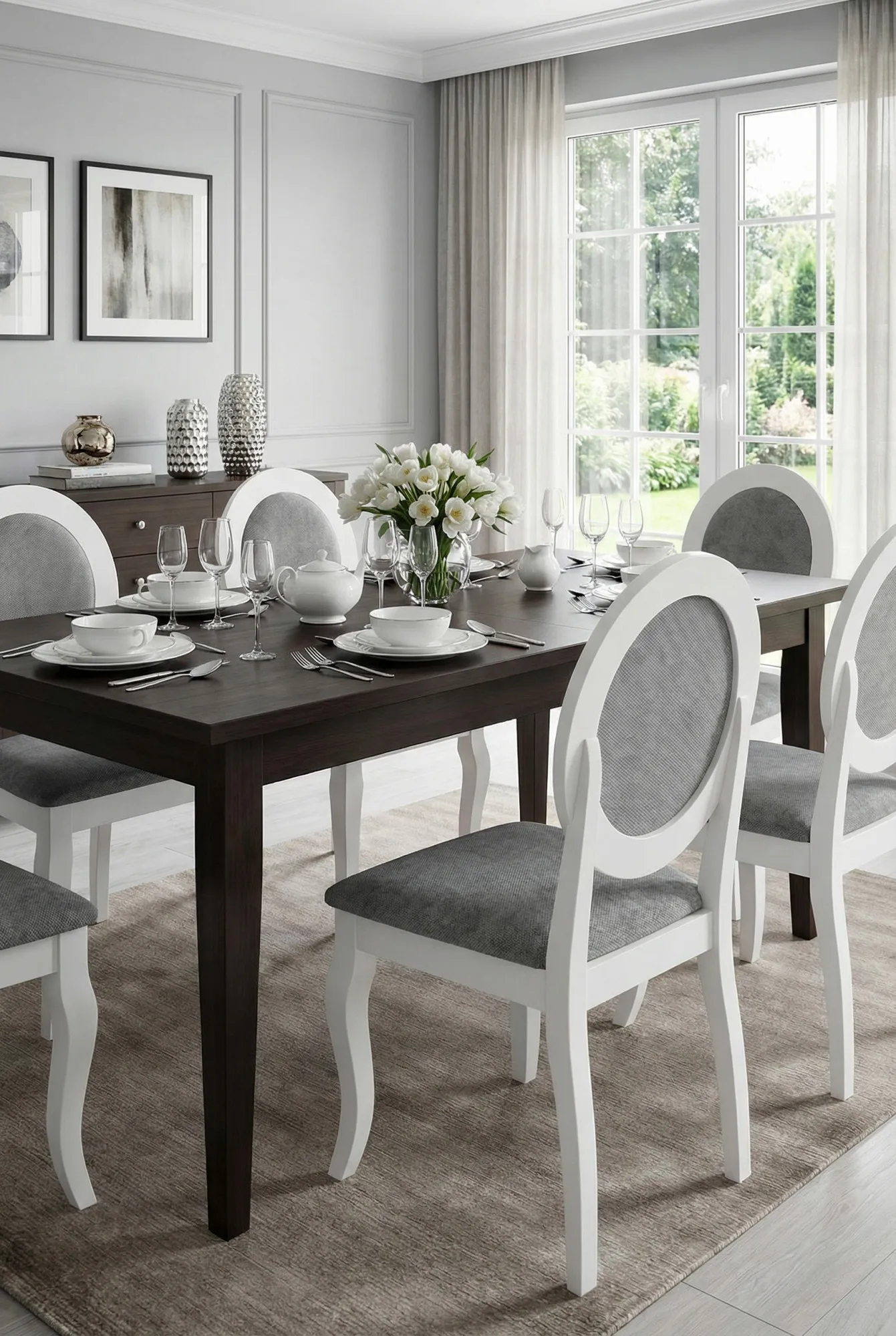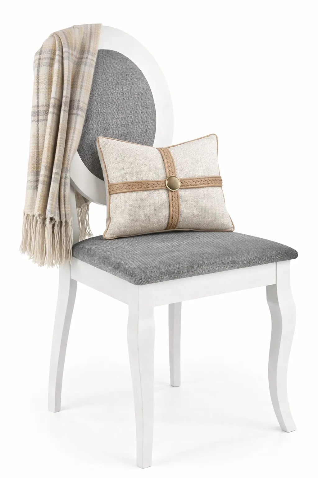 Krzesła medaliony to klasyczne meble tapicerowane przeznaczone do wytwornych jadalni i salonów z aneksem jadalnym. Te wygodne i eleganckie krzesła z owalnym tapicerowanym oparciem, przypominającym formę medalionu, miękkim siedziskiem i finezyjnie wygiętymi nogami odznaczają się niezwykłą wygodą i ponadczasowym urokiem. Krzesło Serta marki Edinos Premium to modelowy przedstawiciel krzeseł medalionów z nutką stylu prowansalskiego. Ten niezwykły model powstał dzięki współpracy marki Edinos Premium z najzdolniejszymi europejskimi designerami. Serta wyróżnia się finezyjną ergonomiczną formą, wykonaną z naturalnego drewna kauczukowego bielonego na przepiękny matowy odcień bieli. Tapicerowane oparcie i siedzisko powstało z luksusowego francuskiego weluru z kolekcji Floores 7R w subtelnym odcieniu szarości. Jasna kolorystyka krzesła optycznie powiększa nawet niewielkie wnętrze, a naturalne drewno nadaje mu przytulnego charakteru. Serta fantastycznie urządzi jadalnię, pokój stołowy lub salon z aneksem jadalnym, nadając wnętrzu prowansalskiego klimatu, pełnej swobodnego komfortu z nutką dyskretnej elegancji. Świetnie urządzą wnętrze kawiarenki, lodziarni, czy stylowego bistro utrzymanego w stylu shabby shic. Twoje wnętrze nabierze niezwykłego klimatu z krzesłami Serta. Wszystko może być sztuką, więc znajduj piękno w drobnych rzeczach. W zapachu lawendy, smaku czekoladowego croissanta na śniadanie, miękkości szarego welwetu na medalionowym oparciu Twojego krzesła Serta.