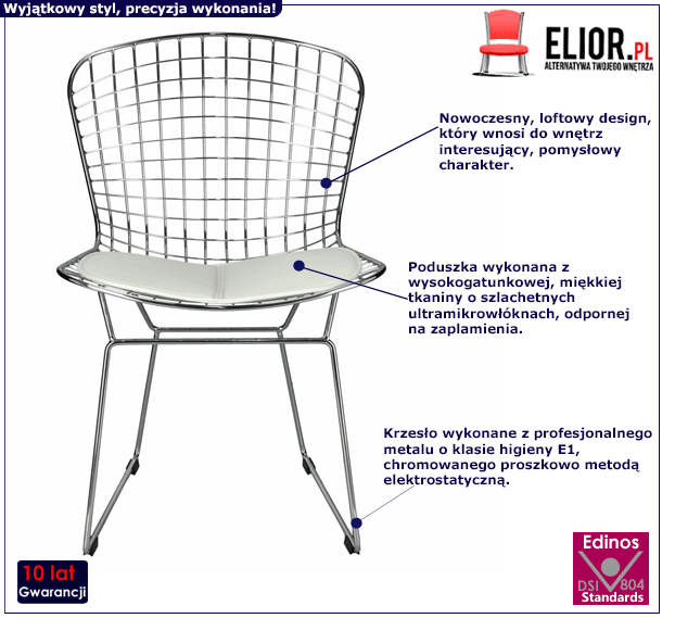 Chcesz, by Twoje nowe krzesło charakteryzowało się trwałością oraz wygodą użytkowania? Jeśli tak, to Nolia 3X jest doskonałą propozycją. To druciane krzesło zaprojektowano naprawdę stylowo i przemyślanie. Nolia 3X powstało z profesjonalnego metalu o klasie higieny E1, chromowanego proszkowo metodą elektrostatyczną. Na siedzisku krzesła umieszczono praktyczną, zdejmowaną poduszkę wykonaną z wysokogatunkowej tkaniny o szlachetnych ultramikrowłóknach, odpornej na zaplamienia i mechacenie się. Podstawa mebla to z kolei wysokogatunkowy metal o klasie higieny E1, malowany proszkowo metodą elektrostatyczną. Jakże to istotne, by meble, w które inwestujemy, cechowało wytrzymałe, staranne wykonanie. Na szczęście z loftowym, pełnym nowoczesnego wdzięku krzesłem Nolia 3X nie trzeba się o to zupełnie martwić!
