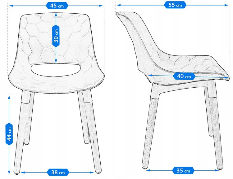• Wymiary: wysokość mebla 77 cm; szerokość mebla 45 cm; głębokość mebla 55 cm; wysokość siedziska 44 cm; szerokość siedziska 45 cm; głębokość siedziska 40 cm; obciążenie maksymalne 130 kg.