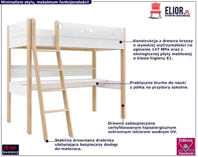Marka Elior od lat specjalizuje się w tworzeniu wysokogatunkowych, bezpiecznych i komfortowych mebli dla dzieci i młodzieży. Wszystkie nasze projekty dedykowane najmłodszym spełniają najwyższe europejskie normy jakościowe i użytkowe. Dbamy również o to, by spełniały także dziecięce marzenia o posiadaniu najpiękniej urządzonego pokoiku na świecie. Jednym z takich wymarzonych modeli jest łóżko Erno 4X, które stanowi wzorcowy miks nowoczesnego wzornictwa z funkcjonalizmem. Model Erno 4X to łóżko typu antresola z podniesioną powierzchnią do spania i praktycznym biurkiem. Łóżko posiada mocne i stabilne barierki, gwarantujące bezpieczeństwo podczas snu oraz skośną drabinkę, która pozwala na łatwy dostęp do materaca. Pod łóżkiem znajduje sie duże wygodne biurko i praktyczna póka na przybory szkolne. Wolna przestrzeń pod biurkiem może zostać dodatkowo wykorzystana jako miejsce do przechowywania. Postawione tam regały lub pojemniki pomieszczą książki, zabawki i wszystkie skarby Twojego dziecka. Takie rozwiązanie pozwala na maksymalne wykorzystanie miejsca, co doskonale się sprawdza w pomieszczeniach o ograniczonym metrażu. Stonowana kolorystyka łóżka Erno 4X pięknie komponuje się z ulubionymi aranżacjami dziecięcych i młodzieżowych aranżacji: od skandynawskiej, klasycznej, marynistycznej, aż po klimaty w stylu rustykalnym i minimalistycznym. Nieszablonowy design mebla wpisuje się w gust i potrzeby zarówno młodszych dzieci jak i nastolatków. A jego wybitna jakość gwarantuje wieloletnie bezpieczne użytkowanie bez konieczności renowacji lub wymiany na nowy model.
