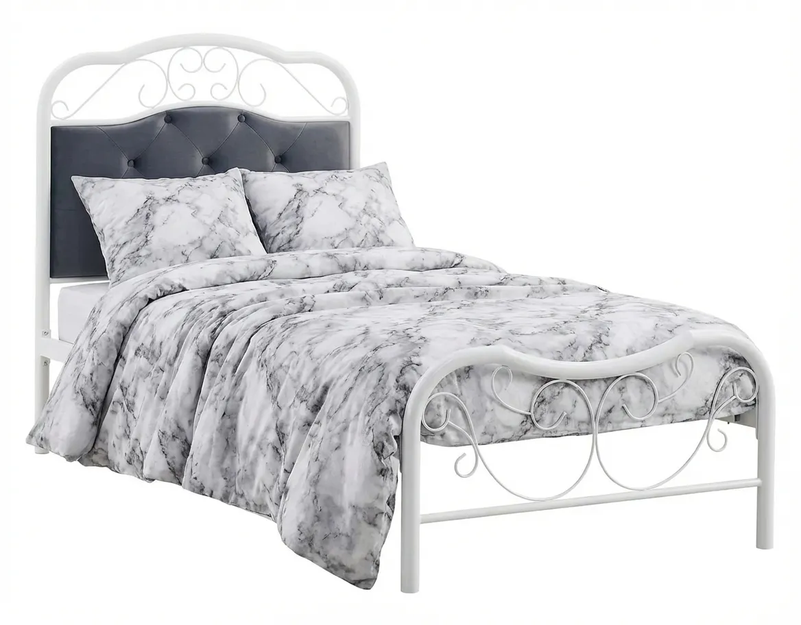 • Odważny design: Białe metalowe łóżko 90x200 cm to prawdziwe arcydzieło, które zachwyca swoim odważnym i nowoczesnym designem. Jego dekoracyjne linie, minimalistyczna forma i elegancki pikowany zagłówek tworzą niepowtarzalne połączenie, które od razu przyciąga spojrzenia i dodaje wnętrzu wyjątkowego charakteru.
