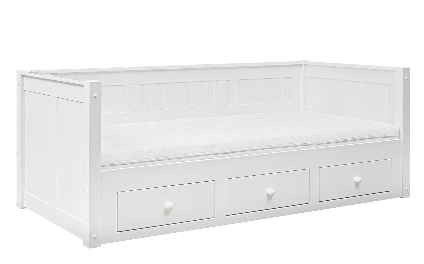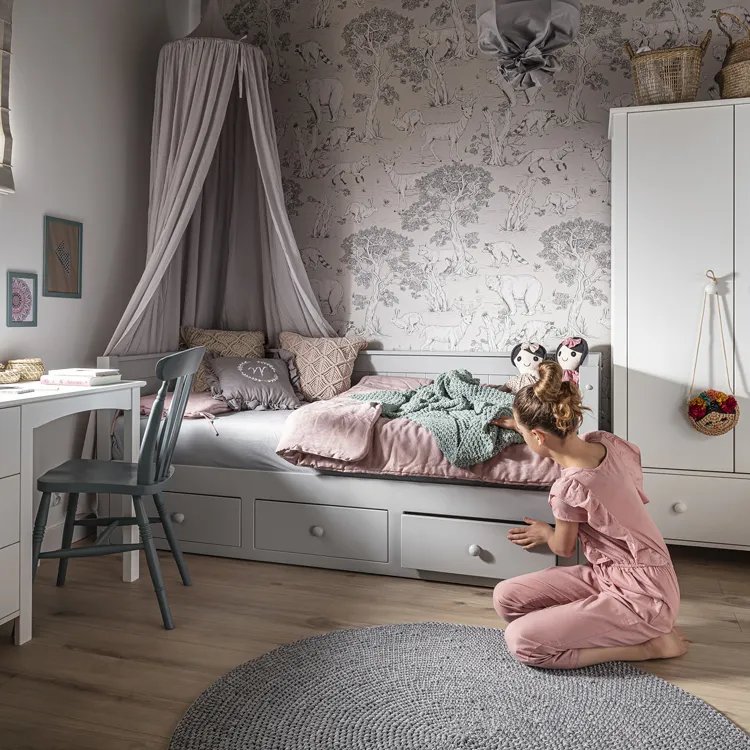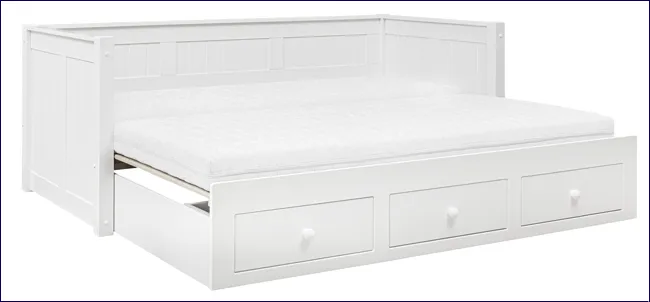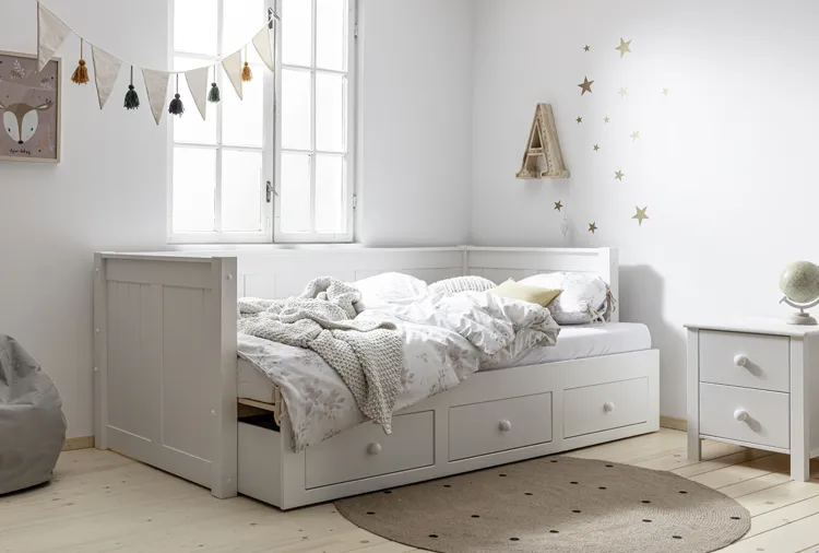 - W zestawie 3 praktyczne szuflady na pościel oraz wysuwany drewniany stelaż z dodatkową powierzchnią do spania.