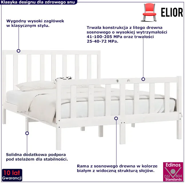 • Solidność i trwałość: rama z naturalnego drewna sosnowego oraz stabilne nogi wraz z dodatkowymi podporami na środku.