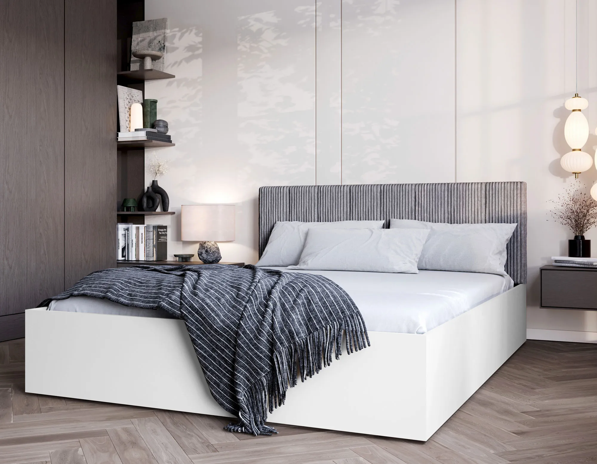 Nowoczesna sypialnia z wykorzystaniem białego łóżka z szarym sztruksowym zagłówkiem Ermini 3X
