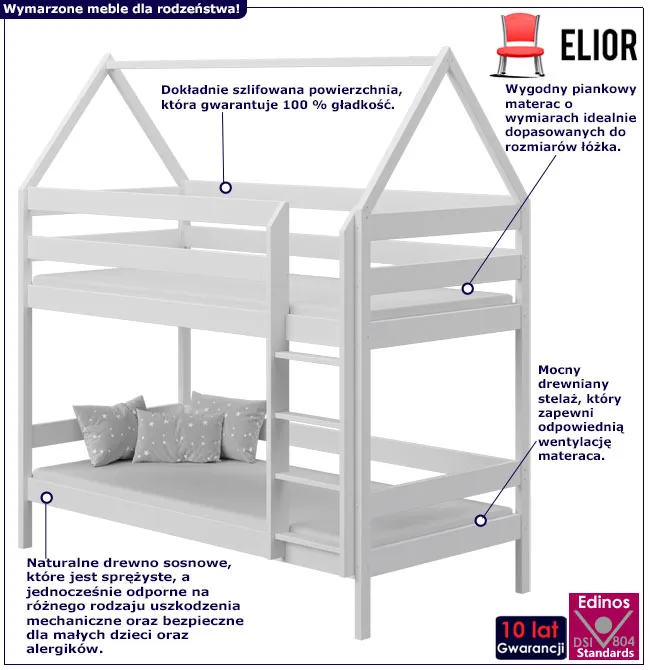 Łóżko wygląda w pokoju dzieci jak mały biały domek, dzieci były zachwycone od pierwszej nocy. Cała konstrukcja jest stabilna, barierki trzymają dobrze, nic się nie chwieje przy wchodzeniu po drabince. Podoba mi się solidne drewno sosnowe i to, że w zestawie od razu są materace, więc nie trzeba nic dodatkowo kompletować.