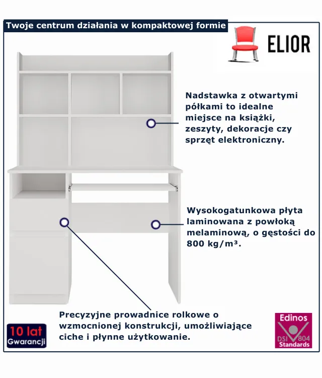 Codzienne obowiązki potrafią przytłoczyć, jeśli nie masz swojego uporządkowanego miejsca do pracy. Wyobraź sobie poranek, w którym siadasz do biurka, a wszystkie notatki, książki i akcesoria biurowe mają swoje miejsce. Blat jest czysty, przestrzeń uporządkowana, a Ty możesz w pełni skupić się na tym, co najważniejsze. Biurko Wado marki Edinos Premium zostało stworzone właśnie z myślą o takich chwilach – pełnych skupienia, efektywności i spokoju. To mebel, który nie tylko ułatwia organizację, ale także wprowadza do wnętrza estetykę i harmonię. W pokoju młodzieżowym, domowym biurze czy kąciku do nauki – Wado zawsze odnajdzie się doskonale.
