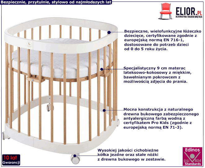 Zdrowy, swobodny rozwój i bezpieczeństwo Twojego dziecka to priorytety marki Elior, dlatego dołożyliśmy wszelkich starań by stworzyć wygodne, bezpieczne i trwałe łóżko, które będzie wiernie towarzyszyć Twojemu dziecku przez pierwsze lata jego życia. Wielofunkcyjne łóżeczko Nigras 4X zostało wykonane z najwyższej jakości, wytrzymałych, ekologicznych materiałów. Z myślą o zdrowiu i bezpieczeństwie Twojego maluszka do produkcji łóżeczka Nigras 4X wybraliśmy wysokiej jakości, twarde i dosyć ciężkie drewno bukowe, charakteryzujące się wysoką gęstością na poziomie do 720 mg/m3 oraz wyjątkowo dużą twardością o wyniku do 98 MPa w pomiarach metodą Janki. Dzięki swojej gęstej strukturze materiał ten jest niezwykle wytrzymały i odporny na uszkodzenie podczas częstych zmian konstrukcji i długotrwałego użytkowania. Dla podniesienia trwałości oraz walorów dekoracyjnych drewniane elementy zabezpieczyliśmy antyalergiczną farbą wodną z certyfikatem Pro Kids (zgodnie z europejską normą EN 716-3). Łóżeczko Nigras 4X nie zawiera elementów, które maluszek mógłby połknąć. Wszystkie materiały wykorzystane w procesie produkcji są całkowicie wolne od toksyn, a łóżeczko jest certyfikowane zgodnie z europejską normą EN 716-1. Zastosowanie materiałów tak wysokiej jakości zapewni bezpieczny i zdrowy sen Twojemu dziecku.
