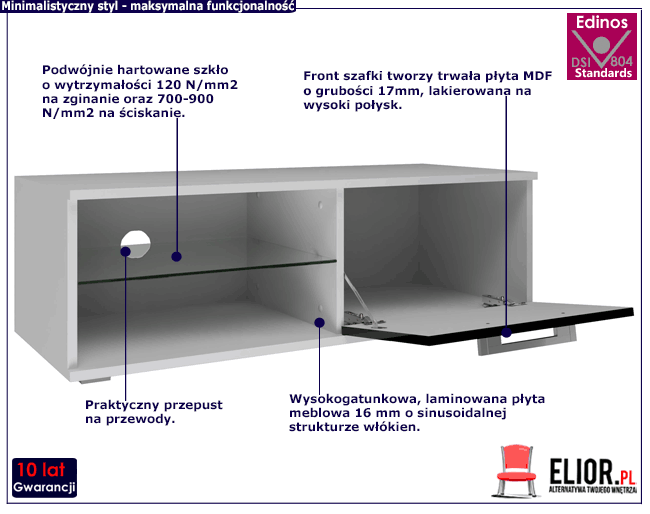 • Produkt posiada certyfikat jakości "Edinos Standards DSI 804", który potwierdza najwyższą jakość wykonania mebla oraz  pełny stopień zgodności poszczególnych jednostek wytworzonego wyrobu z przyjętym wzorcem.