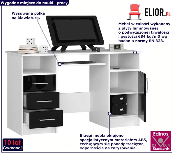 - Modna kolorystyka: biały + czarny. Kliknij w link i sprawdź także inne białe biurka w sklepie Edinos.pl. Stwórz swój praktyczny zestaw mebli.