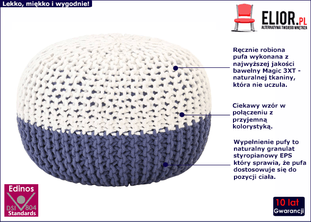 - Kolor: biało-niebieski. Kliknij w link i sprawdź także inne pufy w sklepie Edinos.pl. Stwórz swój praktyczny zestaw mebli.