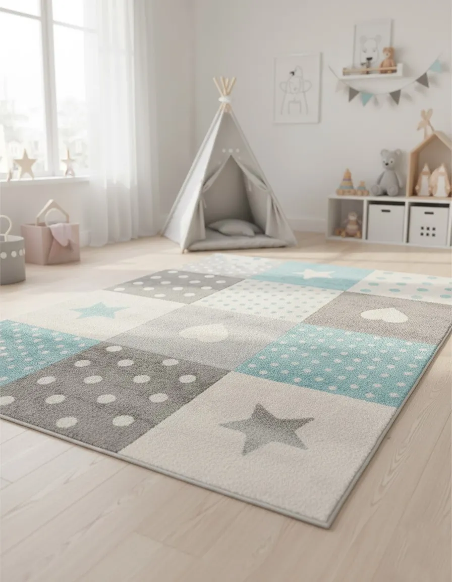 Bardzo estetyczny dywan turkusowe akcenty ładnie rozświetlają pokój i pasują do dziecięcych dekoracji. Jest ok.