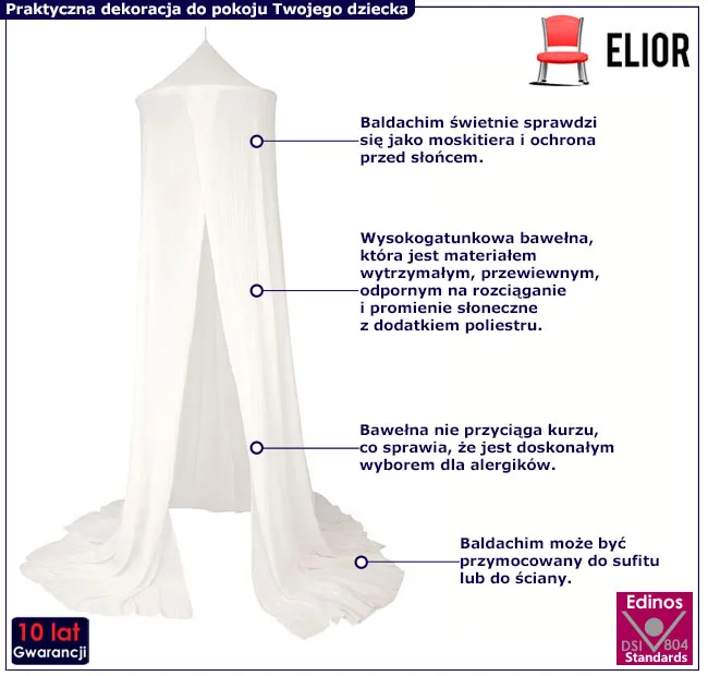 Dzięki baldachimowi Edon pokój Twojej Pociechy stanie się bardziej przytulny. To także doskonałe rozwiązanie podczas snu i zabawy Twojego dziecka. Już dziś możesz go zamówić w promocyjnej cenie 318 zł! Zaufaj marce Edinos Premium, która tworzy dla Ciebie i Twojego dziecka!