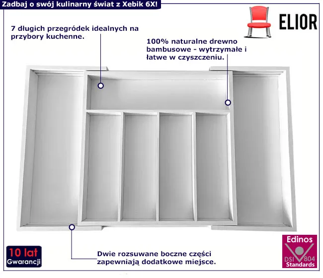 Vaso 6X marki Edinos Premium to wyjątkowy wkład na sztućce, który zachwyca swoją funkcjonalnością i elegancją. Dzięki 7 pojemnym przegródkom i rozsuwanej konstrukcji, organizacja kuchni staje się łatwa i przyjemna. Nie czekaj, zamów teraz i przekonaj się, jak Vaso 6X może odmienić Twoją kuchnię! Zdecyduj się już dzisiaj na zakup w rewelacyjnej cenie promocyjnej. Powyższa oferta dotyczy wkładu w kolorze białym w cenie 74 zł. Regularna cena tego produktu to 88 zł. Zamawiając go właśnie teraz zyskujesz aż 14 zł rabatu!