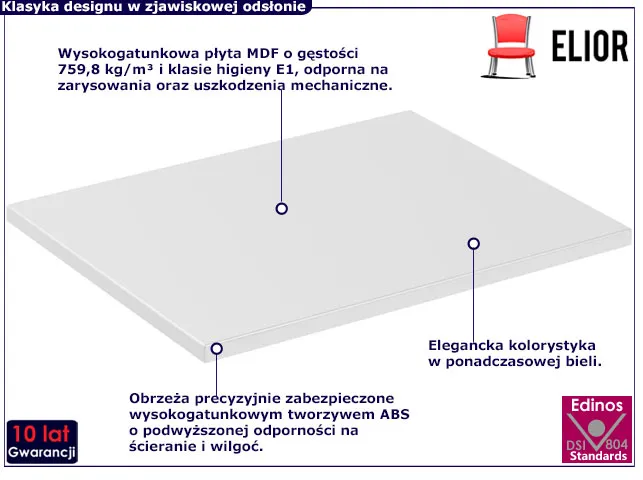 • Produkt posiada certyfikat jakości "Edinos Standards DSI 804", który potwierdza najwyższą jakość wykonania mebla oraz pełny stopień zgodności poszczególnych jednostek wytworzonego wyrobu z przyjętym wzorcem.