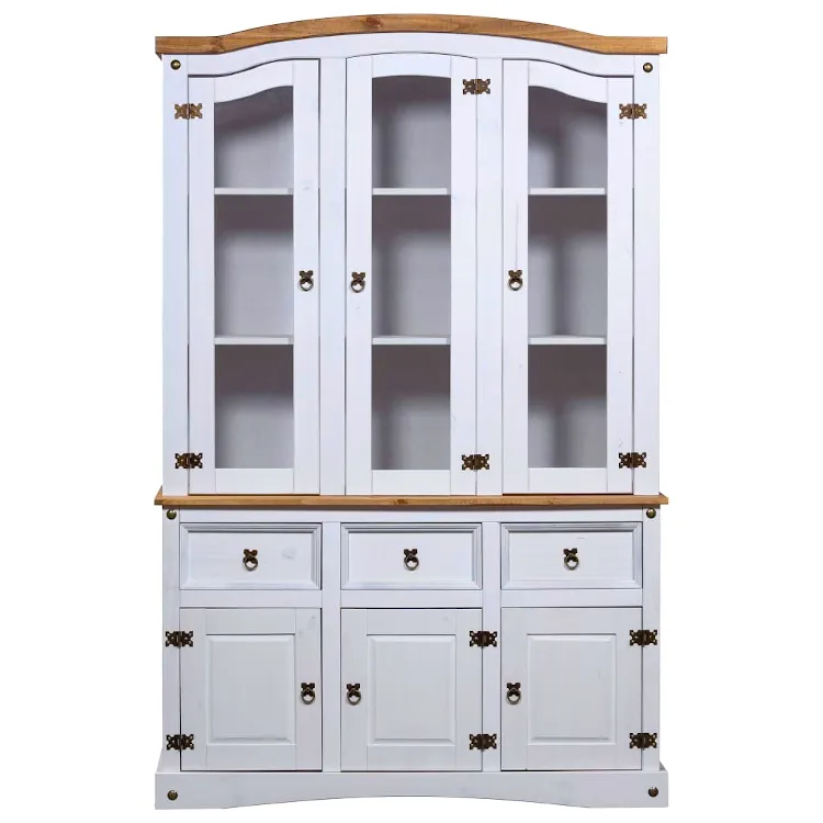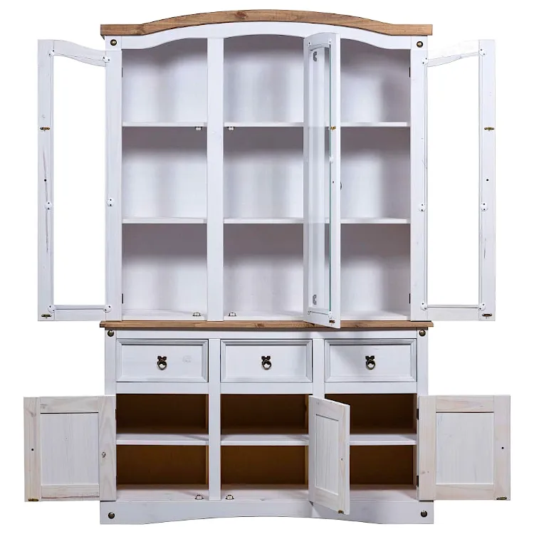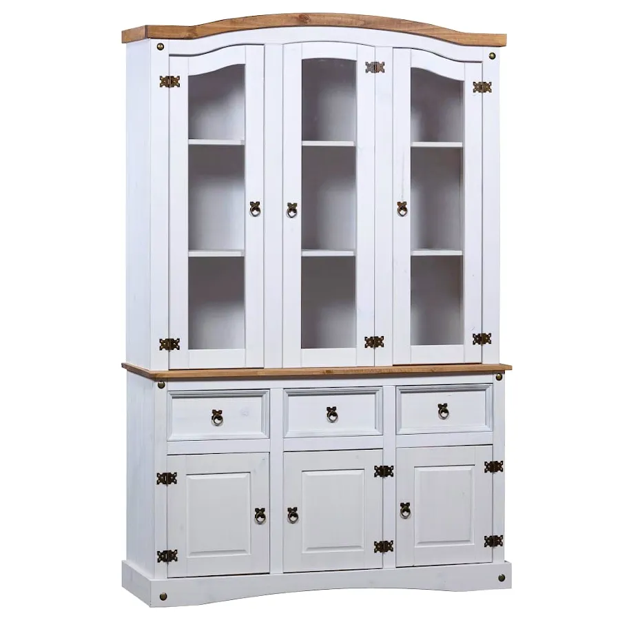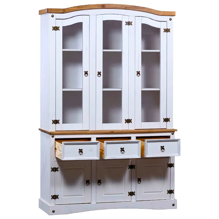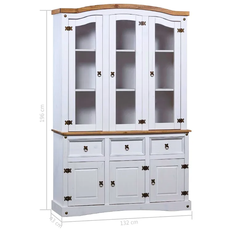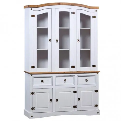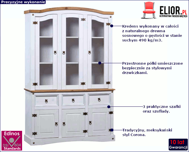 W dzisiejszych czasach w praktycznie każdym domu można znaleźć kredens. Dlatego bardzo często meble te wydają się być nudne i powtarzalne. Merko swoim projektem udowadnia, że można przełamać te schematy. Utrzymany w meksykańskim, zjawiskowym stylu Corona nada Twojemu wnętrzu żywego, rustykalnego charakteru. Świetnie sprawdzi się w salonach oraz przedpokojach urządzonych w stylu klasycznym, rustykalnym, retro, vintage oraz wszędzie tam, gdzie ceniony jest naturalny wygląd i materiały. 9 przestronnych półek znajdujących się za praktycznymi, przeszklonymi drzwiczkami zapewnią wystarczająco dużo miejsca do przechowywania, a także wyeksponowania eleganckich przedmiotów dekoracyjnych. 3 pojemne szuflady oraz szafki, każda wyposażona w 2 półki, dodatkowo zwiększają ilość dostępnej przestrzeni. Koniec z bałaganem oraz brakiem zorganizowania! Wytrzymałą konstrukcję Merko wykonano w całości z naturalnego, litego drewna sosnowego, dzięki czemu kredens może poszczycić się naturalnym wyglądem oraz najlepszą trwałością, która nie przeminie przez wiele lat.