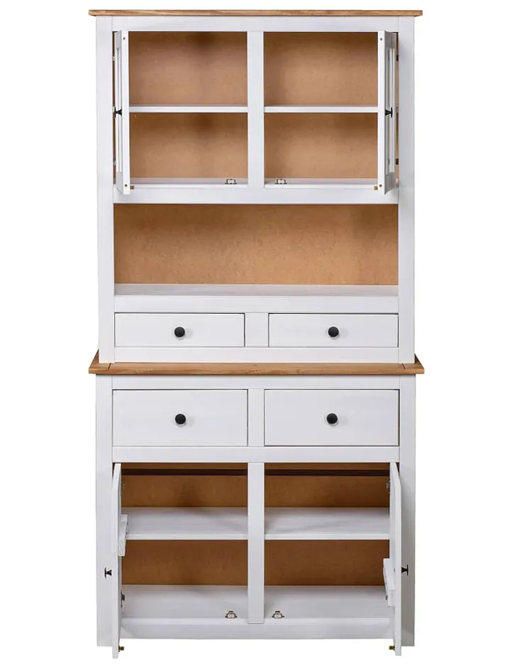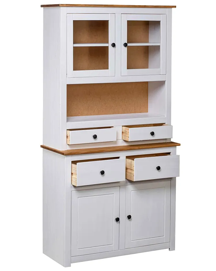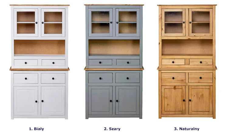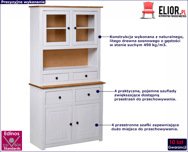 Romda to kredens, który sprawdzi się w praktycznie każdym domu. Spokojny, neutralny kolor oraz konstrukcja utrzymana w stylu rustykalnym, skutecznie nadadzą Twojemu wnętrzu harmonijnego i delikatnego charakteru. 2 Przeszklone szafki w górnej części mebla, wyposażone łącznie w 4 półki, przestronna półka oraz 2 szuflady zapewnią ogromną ilość miejsca do przechowywania nawet niewymiarowych przedmiotów o sporych wymiarach. W dolnej części mebla znajdują się 2 duże szuflady oraz kolejne 2 szafki, które mają po 2 półki wewnątrz. Dzięki temu zyskujesz ogromną przestrzeń do przechowywania. Koniec z bałaganem oraz chaosem wśród drobiazgów! Kredens wykonano w całości z naturalnego, litego drewna sosnowego. Dzięki temu Romda może poszczycić się niezwykłą trwałością i odpornością na wszelkie uszkodzenia mechaniczne, a naturalne usłojenie drewna nadaje mu dodatkowego, rustykalnego uroku. Wszystkie powyższe cechy sprawiają, że kredens ten świetnie sprawdzi się w salonie, kuchni, jadalni czy przedpokoju.