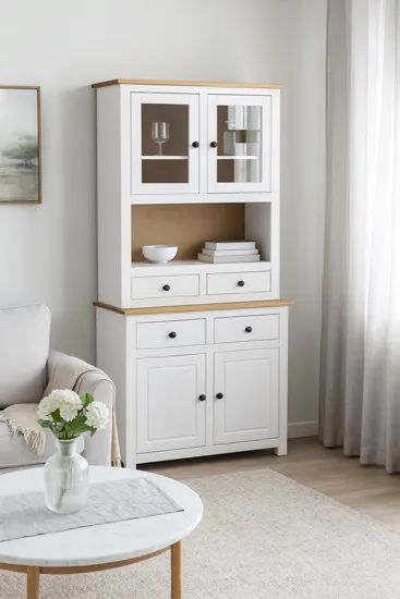 Biały drewniany kredens z witryną Romda w promocyjnej cenie 1498 zł (zamiast 1868 zł) tylko w tej ofercie!!! Zamawiając ją zyskujesz aż 370 zł rabatu już teraz!