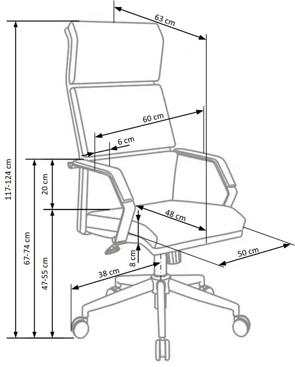 - Wymiary: szerokość siedziska: 60 cm, głębokość siedziska: 63 cm, wysokość krzesła: 117-124 cm, wysokość siedziska: dowolnie regulowana.