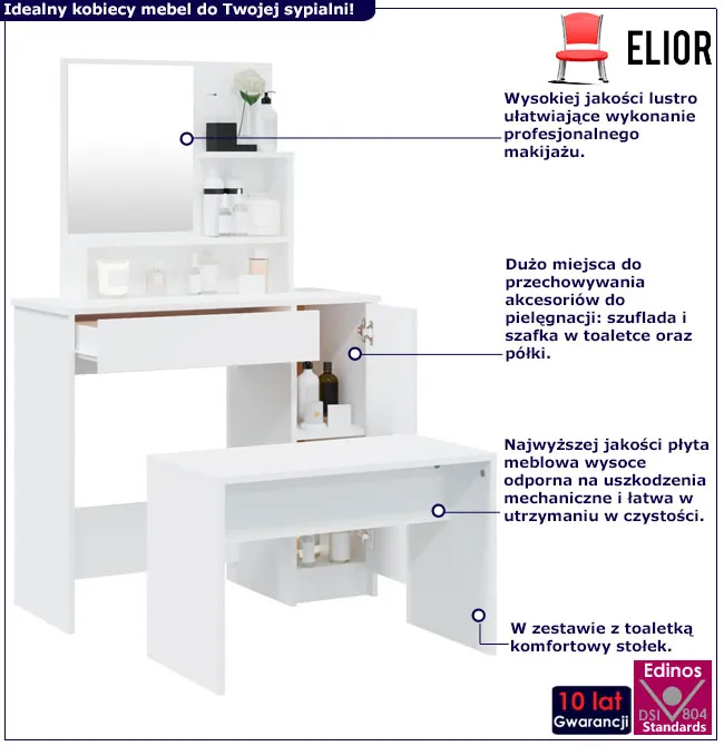 Z toaletką Haleb 5X marki Edinos Premium każde rano stanie się obietnicą nowego początku, a Ty będziesz jak reżyser swojego dnia. Pozwól sobie na chwilę luksusu i zorganizuj swoje kosmetyki w stylu, który mówi więcej niż tysiąc słów. Niech toaletka ze stołkiem Haleb 5X stanie się Twoim osobistym sanktuarium piękna, gdzie każdy szczegół tworzy symfonię stylu i funkcjonalności. Zamów teraz za jedyne 658 zł i przekonaj się sama!