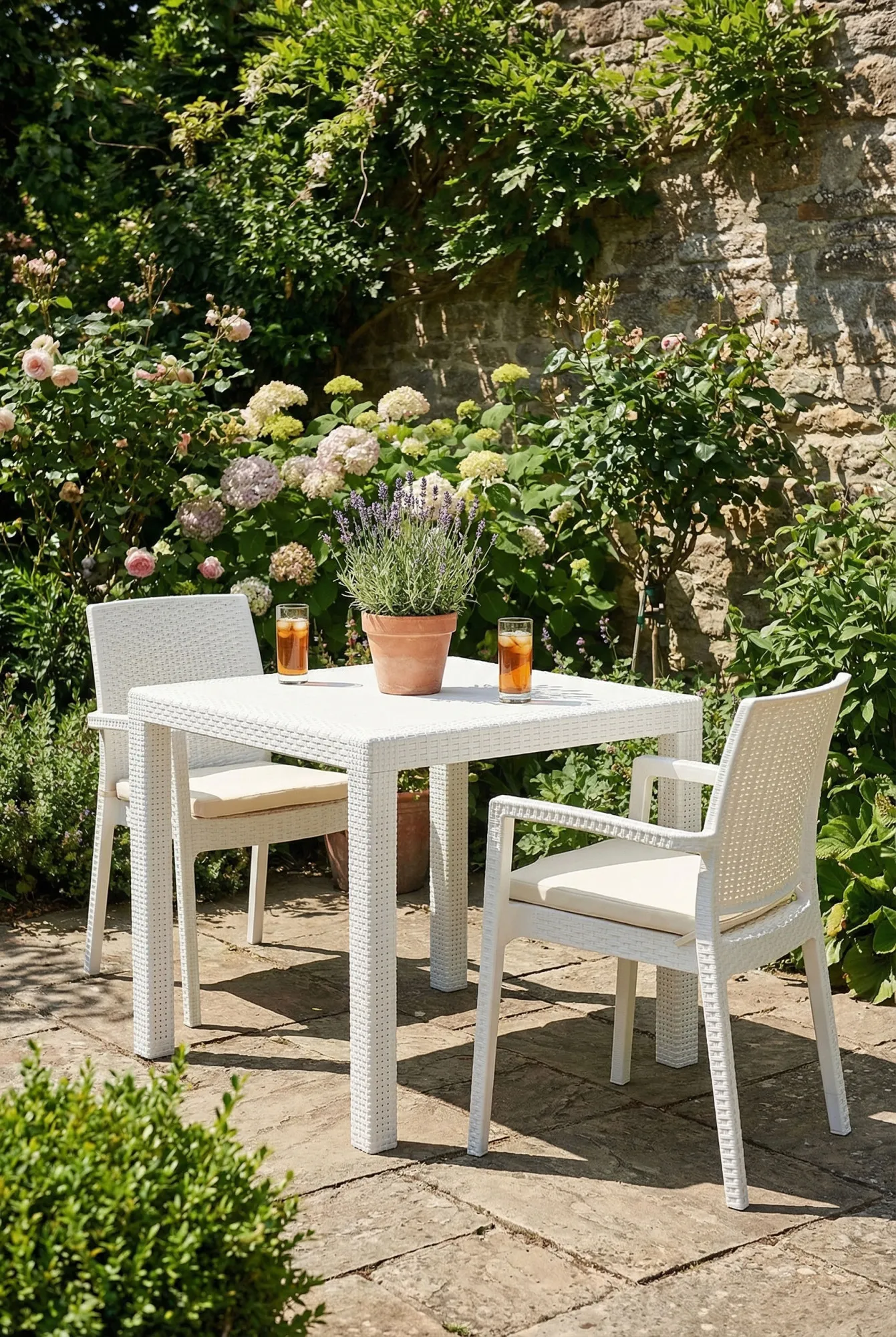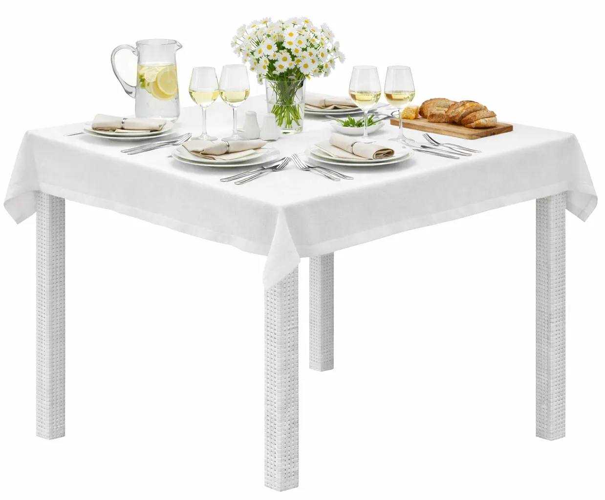 Aranżacja ogrodu z białym kwadratowym stołem Atem