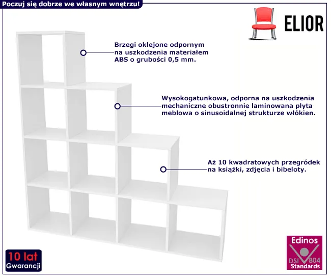 Kto by pomyślał, że powstanie dziedzina, która zajmuje się wpływem wnętrza na samopoczucie człowieka? Tak - ona naprawdę istnieje. Ma nawet swoją nazwę: psychologia architektury bądź wnętrza. Choć wydaje się to nieco dziwne, to gdyby się nad tym głębiej zastanowić - już takie nie będzie. Przecież faktem jest, że inaczej czujesz się w ciasnym, zabałaganionym i ciemnym pomieszczeniu, a zupełnie inaczej w przestronnym, estetycznym i jasnym wnętrzu. Prawda? W związku z tym mamy dla Ciebie propozycję. Urządź swoją przestrzeń z minimalistycznym regałem Merolo marki Edinos Premium i poczuj się najlepiej, jak to możliwe!