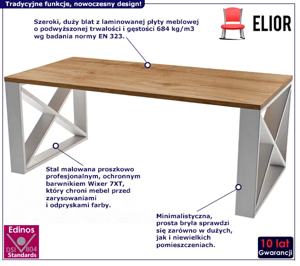 Trendy dotyczące projektowania i aranżacji wnętrz na przestrzeni ostatnich lat znacznie ewoluowały. Przepych ustąpił miejsca praktycznemu i oszczędnemu w formach minimalizmowi. Taki niewymuszony styl, cechujący się prostą, geometryczną bryłą wyróżnia się jednak elegancją. Jeśli bliskie jest Ci przekonanie, że mniej znaczy więcej stolik Fixa 6Z marki Elior jest rozwiązaniem dla Twojego domu! Na szerokim, solidnym blacie postawisz nie tylko dzbanek z ulubioną kawą oraz herbatą: stolik Monello może zastąpić dotychczasowe szafki nocne przy łóżku, czy sprawdzić się jako miejsce do zabawy dla Twoich dzieci. Kompaktowe wymiary oferowanego przez nas mebla oraz jego loftowy charakter sprawiają, że Monello zaprzyjaźni się z każdym rodzajem wnętrz. Twój dom wypełniony jest akcentami industrialnymi i przemysłowymi? A może cechują go klasyczne i skandynawskie aranżacje? Niezależnie od tego, jak zaprojektowane jest Twoje mieszkanie, stolik Fixa 6Z wkomponuje się w jego przestrzenie. Oszczędną formę blatu uzupełniają dwie, oryginalne nóżki w kształcie litery X. Taki nieregularny kształt konstrukcji wprowadzi do Twojego salonu niebanalny design, który od razu zwróci uwagę Twoich gości!