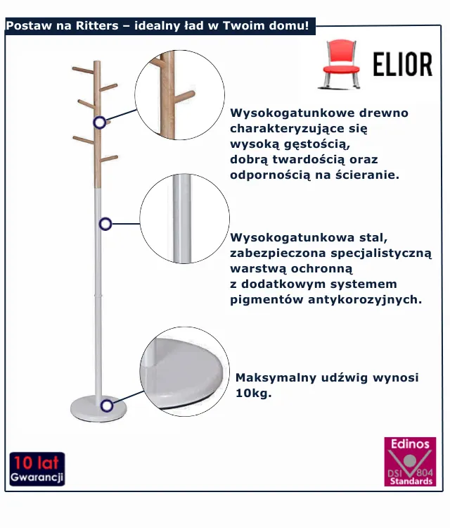 - Produkt posiada certyfikat jakości "Edinos Standards DSI 804", który potwierdza najwyższą jakość wykonania mebla oraz pełny stopień zgodności poszczególnych jednostek wytworzonego wyrobu z przyjętym wzorcem.