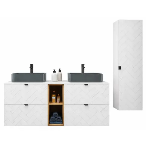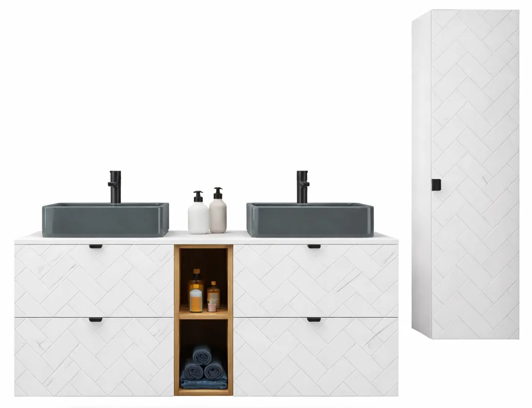 Komplet mebli łazienkowych Aploni 18X marki Edinos Premium to styl i nowoczesna funkcjonalność w jednym. Zestaw obejmuje 2 szafki pod umywalkę o szerokości 60 cm, półkę i słupek do przechowywania, które perfekcyjnie wpiszą się w przestrzenne wymagania większości łazienek, a ich unikatowa cecha - fronty ozdobione eleganckim wzorem angielskiej jodełki - nadadzą wnętrzu niepowtarzalny charakter.