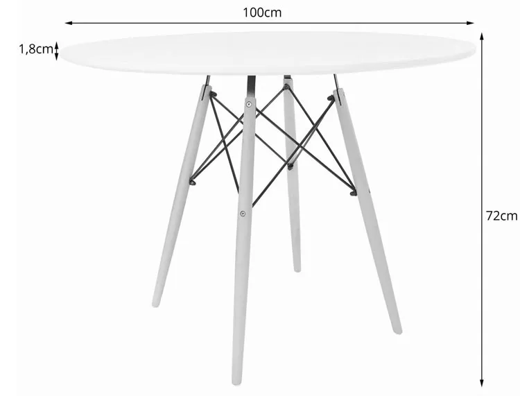 • Wymiary całkowite: średnica 100 cm, wysokość 72 cm, grubość blatu 18 mm.