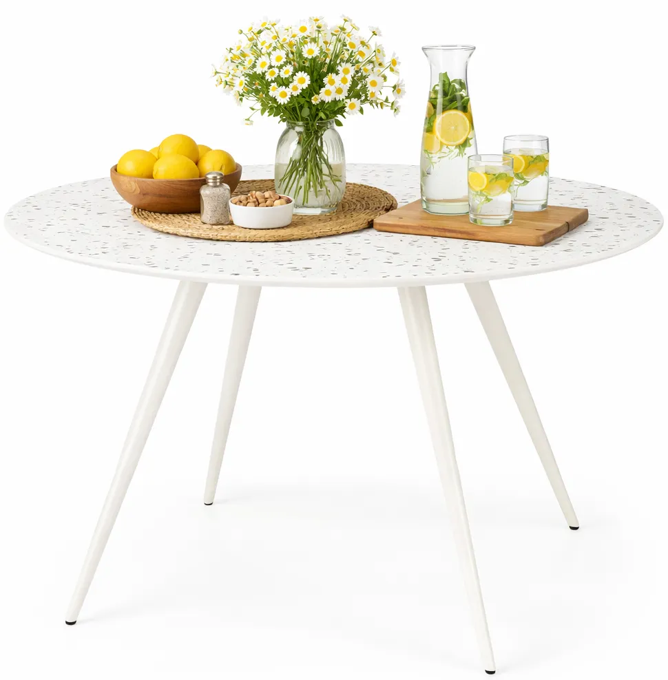 - Praktyczna funkcjonalność - Okrągły blat stołu wykonany z trwałej płyty MDF i HPL gwarantuje wysoką funkcjonalność, wytrzymałość i łatwość w utrzymaniu czystości.