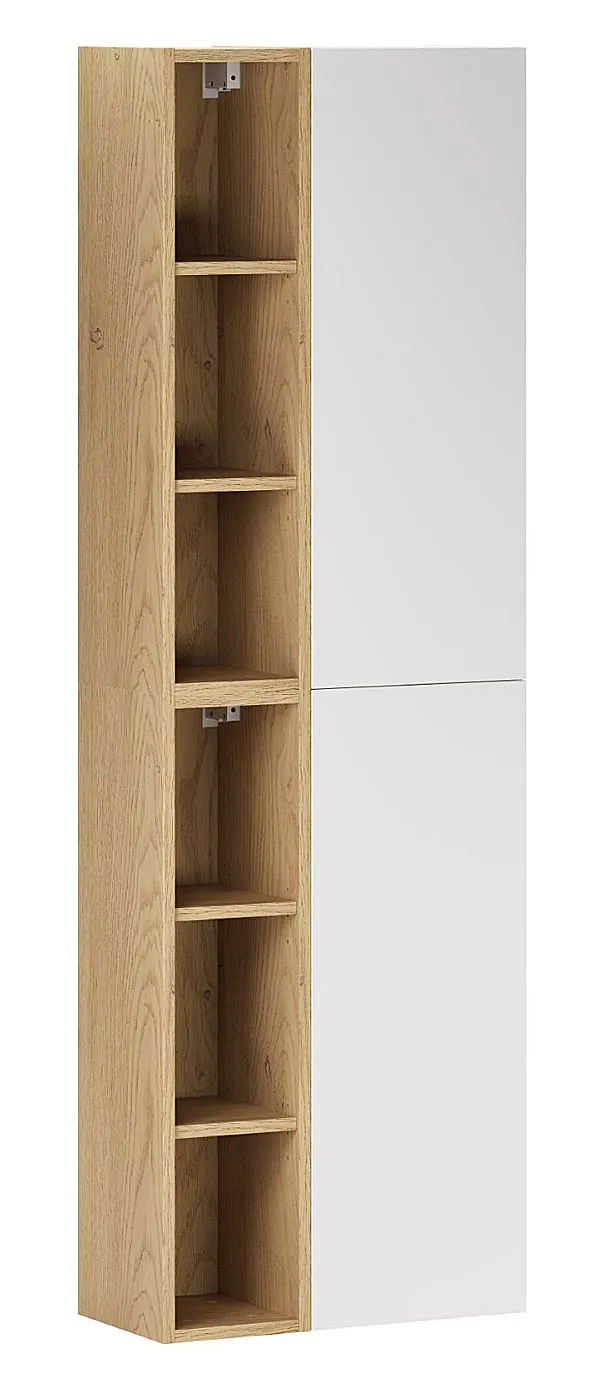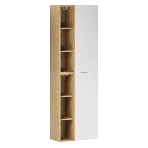 Wiszący słupek łazienkowy Verdessa 5X to funkcjonalny mebel zaprojektowany z myślą o nowoczesnych łazienkach, w których liczy się lekkość formy i dobrze zorganizowana przestrzeń. Smukła, pionowa bryła pozwala maksymalnie wykorzystać miejsce przy ścianie, nie obciążając wizualnie wnętrza. Połączenie matowego frontu w odcieniu bieli z ciepłym dekorem drewna nadaje meblowi naturalny, przytulny charakter. Otwarta część z półkami ułatwia szybki dostęp do najczęściej używanych akcesoriów, natomiast zamykana strefa pozwala estetycznie ukryć pozostałe elementy wyposażenia łazienki.