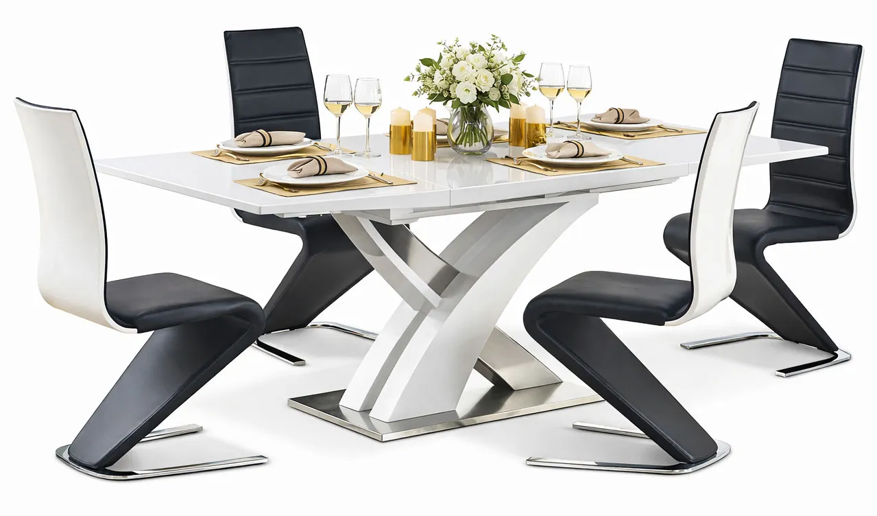 Elegancja, wdzięk i jakże modny ostatnio minimalizm to cechy najnowszego zestawu Quixos i pokusa nie tylko dla Twojego oka. Komplet ten wyróżnia się nie tylko swoją unikalną formą ale także zastosowaniem materiałów najlepszej jakości. To dlatego cieszy się on powodzeniem wśród osób lubiących ciekawe rozwiązania. Użyta do produkcji stołu lakierowana płyta laminowana MDF w kolorze biały połysk, została uszlachetniona cienkimi filmami melaminowymi. Posiada także specjalne włókna ułożone różnokierunkowo o strukturze sinusoidalnej, co zapewnia nadanie jej cech jakościowych oraz wytrzymałościowych. Designerski blat wykonany został ze specjalnej płyty komórkowej, której główną zaletą jest redukcja ciężaru bez utraty stabilności oraz innych funkcji konstrukcyjnych. Za pomocą wygodnej prowadnicy wraz z rolką, możesz szybko rozłożyć blat stołu o długości 160 cm do aż 220 cm. Już nie musisz martwić się o miejsca przy stole na kolejnej domowej imprezie. Nowy stół Quixos jest z pewnością praktyczny i wyjątkowo elegancki. Dodatkowo zawiera on w komplecie 4 doskonale dopasowane i designerskie krzesła.