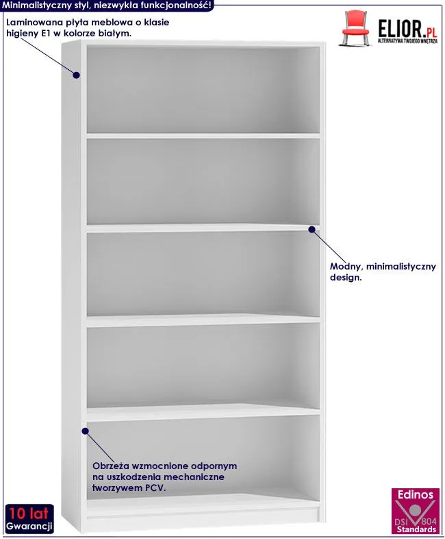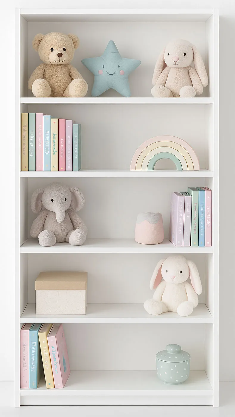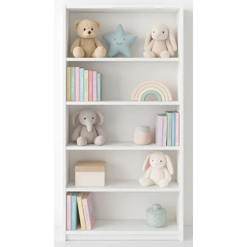 • 5 pojemnych półek – umożliwiają wygodne segregowanie książek, dokumentów, dekoracji lub zabawek.