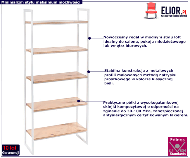 Minimalistyczny regał Maso 10X marki Elior to nowoczesny projekt dedykowany miłośnikom niesztampowego designu, minimalizmu aranżacyjnego i ponadczasowej jakości. Konstrukcja regału Maso 10X powstała z najwyższej jakości metalu pomalowanego proszkowo profesjonalnym barwnikiem w odcieniu klasycznej bieli. Najwyższa jakość techniki metody natrysku proszkowego pozwoliła zaoferować firmie Elior aż 10 lat gwarancji na swoje produkty. Technika malowania proszkowego charakteryzuje się dużą trwałością, odpornością na korozję, chemikalia, wysoką temperaturę oraz uszkodzenia mechaniczne, dzięki czemu znacznie podnosi walory użytkowe i estetyczne mebla. Regał Maso 10X został wyposażony w 5 praktycznych półek z naturalnej sklejki kompozytowej zbudowanej z krzyżujących się cienkich warstw drewna (obłogów). Dla zwiększonej trwałości sklejka składa się z nieparzystej liczby obłogów, dzięki czemu jest niezwykle elastyczna, daje się łatwo modelować, charakteryzuje się ponadprzeciętną trwałością i odpornością na zginanie do 30-100 MPa ( według normy PN-EN 310). Półki o grubości 18 mm zostały przykręcone do metalowych profili specjalistycznymi metalowymi śrubami, dzięki czemu są wyjątkowo stabilne i wytrzymałe na nacisk. Dla podniesienia jakości i walorów estetycznych półki zostały precyzyjnie zabezpieczone certyfikowanym lakierem o właściwościach antystatycznych i hipoalergicznych. Tak wykonany regał Maso 10X marki Elior to kwintesencja doskonałej jakości i gwarancja wieloletniej trwałości.