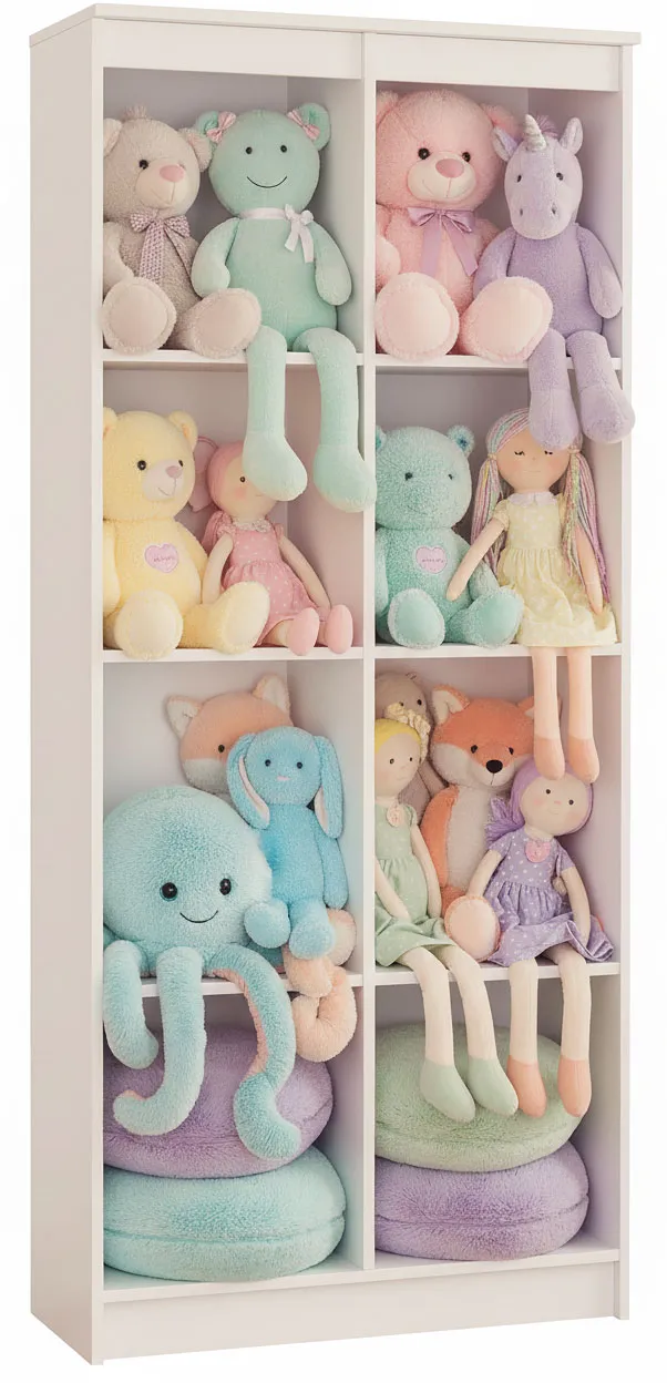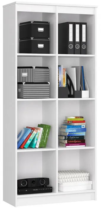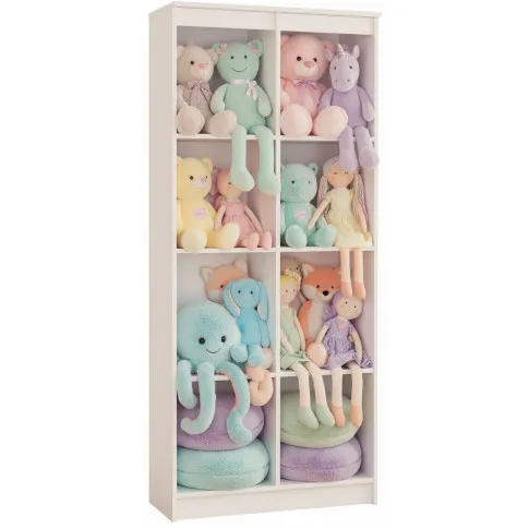 Regał na zabawki Daris wyposażony jest w osiem pojemnych półek, które umożliwiają przechowywanie pluszaków, klocków, gier planszowych oraz książek – zarówno na widoku, jak i w kolorowych pojemnikach lub pudełkach. Taki układ pozwala łatwo dopasować sposób przechowywania do wieku dziecka i rodzaju zabawek. Otwarta konstrukcja regału zapewnia szybki dostęp do zawartości i sprzyja samodzielności najmłodszych podczas sprzątania po zabawie.