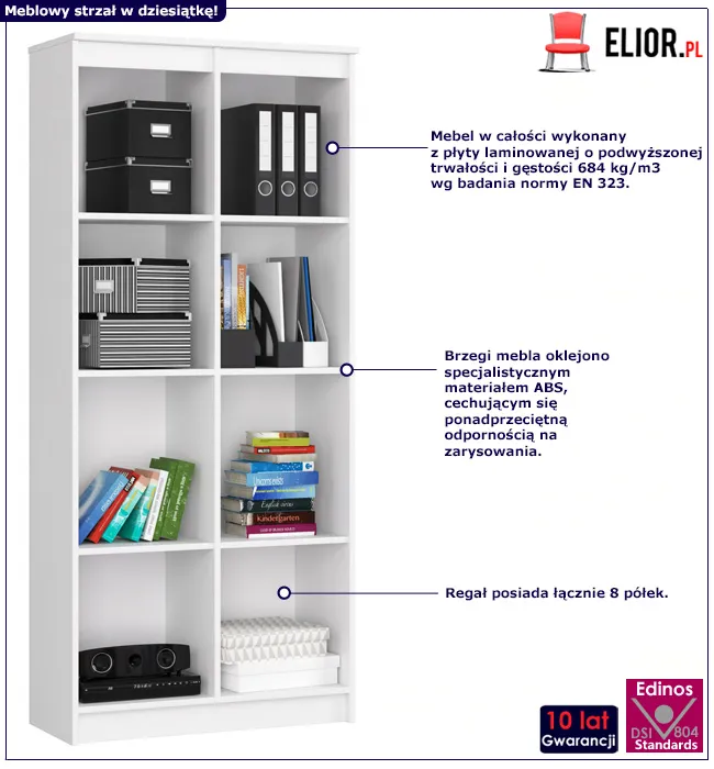 Regał Daris został stworzony z laminowanej płyty meblowej o klasie higieny E1, uszlachetnionej cienkimi filmami melaminowymi. Posiada także specjalne włókna ułożone różnokierunkowo o strukturze sinusoidalnej, co zapewnia nadanie jej cech jakościowych oraz wytrzymałościowych. Dla zwiększenia wytrzymałości i trwałości mebla, obrzeża regału wykończono odpornym na uszkodzenia mechaniczne tworzywem ABS. Wszystko to zapewnia utrzymanie w porządku naszych zbiorów i pamiątek przez wiele lat oraz satysfakcję z dobrze wybranego regału Daris marki Edinos Premium.