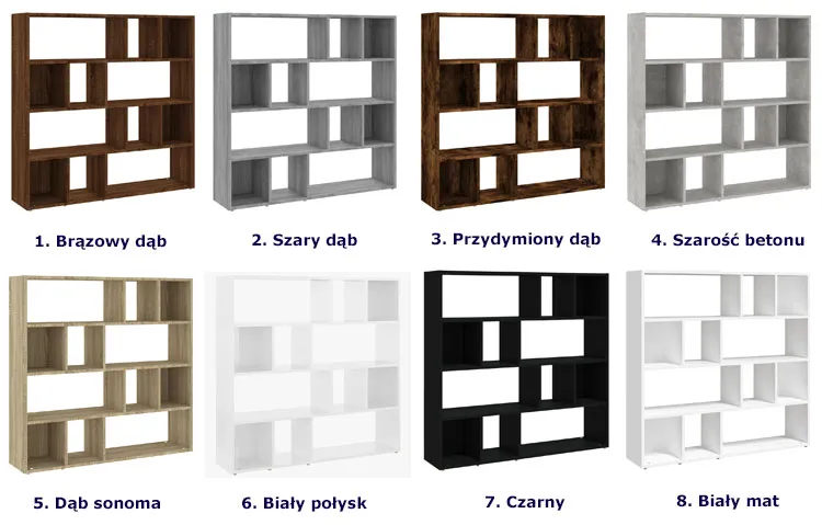 • 12 półek o asymetrycznym ułożeniu nadających wnętrzu nowoczesny charakter